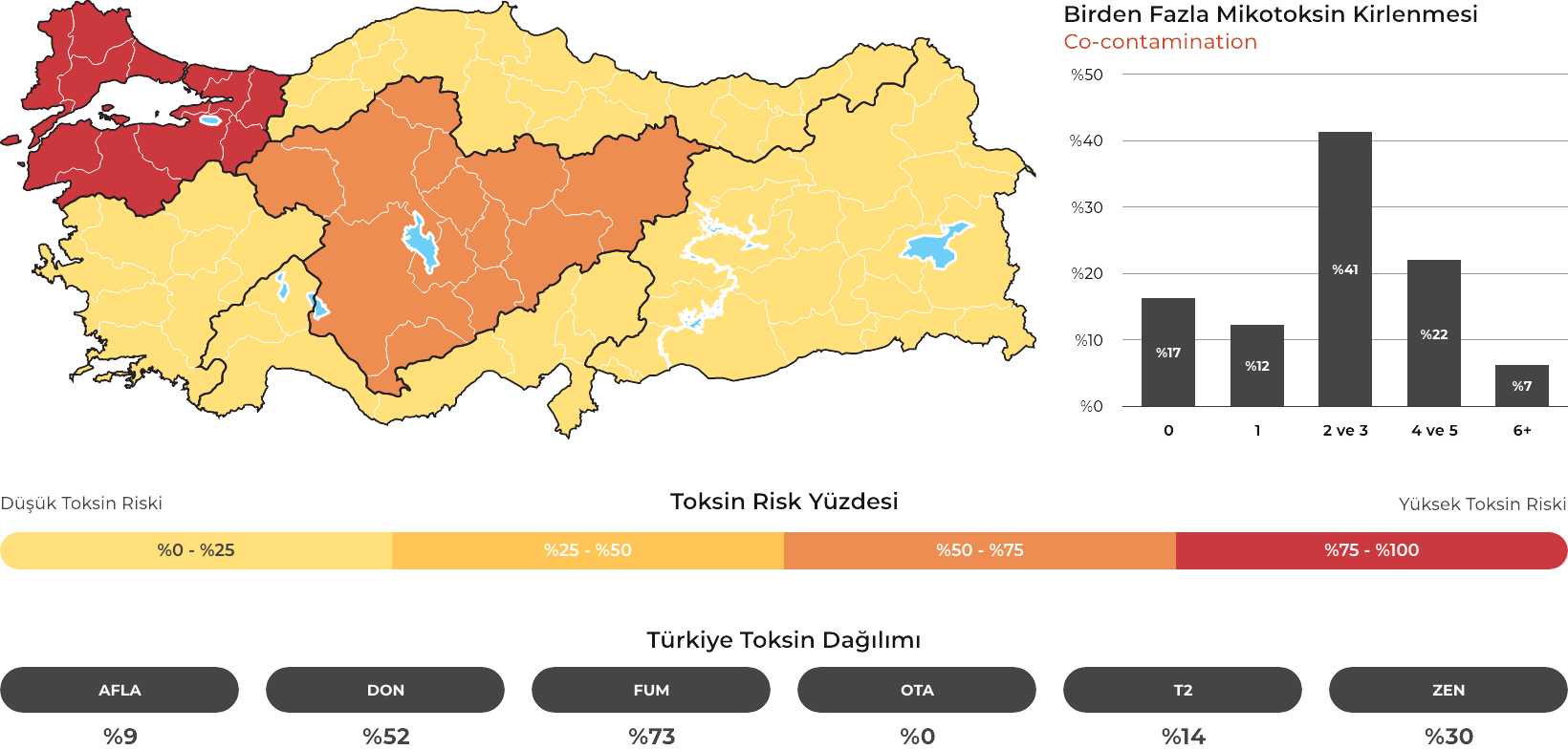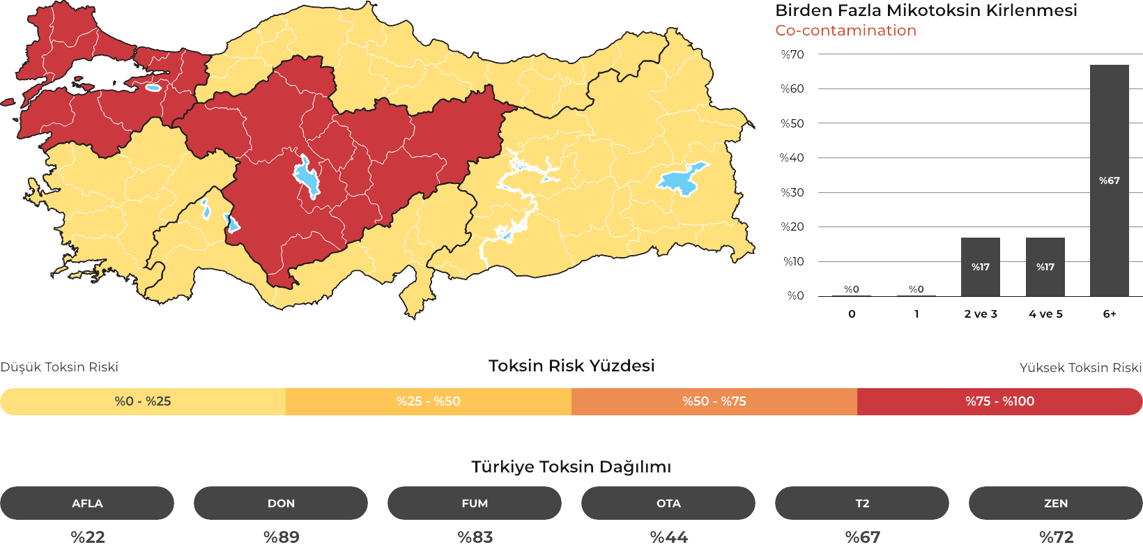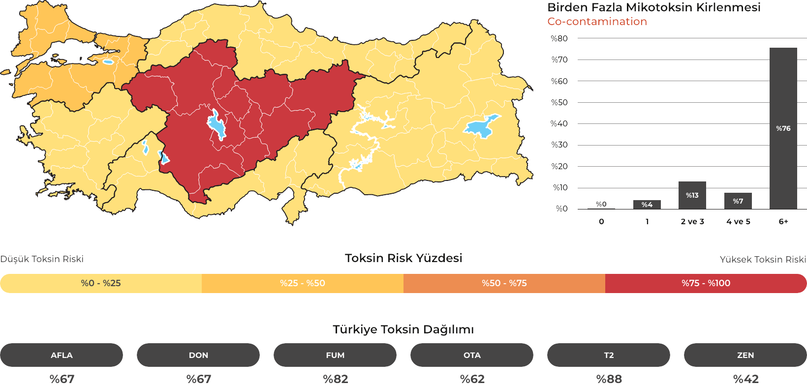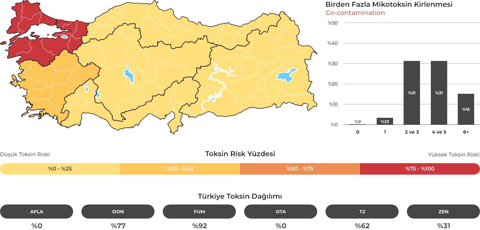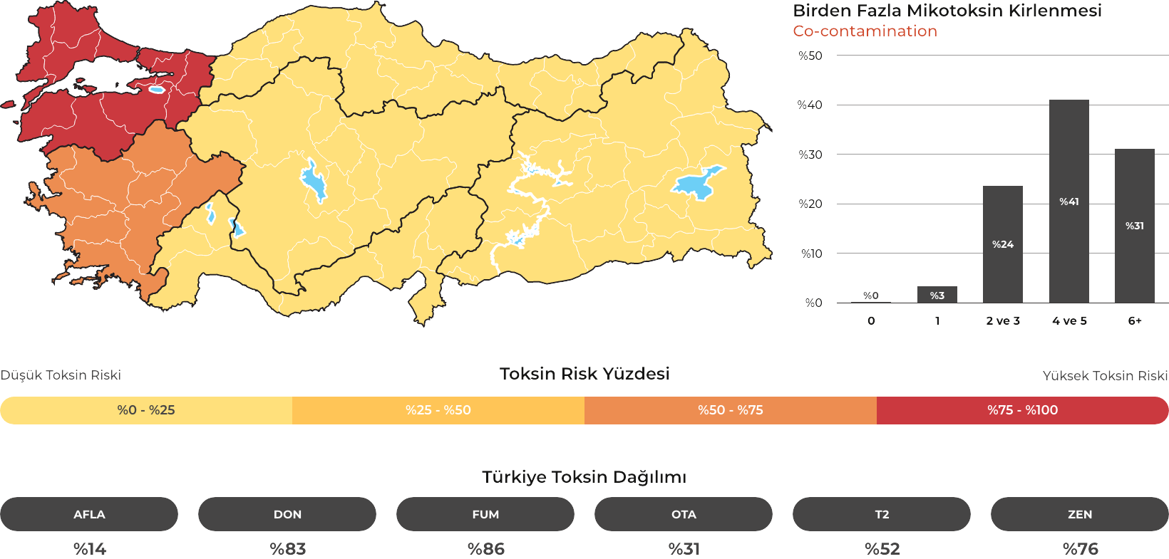 MYCOTRACE®, FAST Lab tarafından analiz edilen yem ve hammadde numunelerinden elde edilen veriler doğrultusunda, Türkiye’de mikotoksin kontaminasyonunun bölgesel ve mevsimsel dağılımını ortaya koymak ve mikotoksin riskini yıl ve çeyrek bazında sistematik olarak izlemek amacıyla geliştirilmiş bir risk analiz ve raporlama sistemidir. Güncel veriler sayesinde majör mikotoksinlerin görülme sıklığı ve risk seviyeleri düzenli olarak değerlendirilmekte; bölge, dönem ve matris bazlı farklılıklar görünür kılınarak işletmelerin karar süreçlerine bilimsel bir zemin sunulmaktadır.