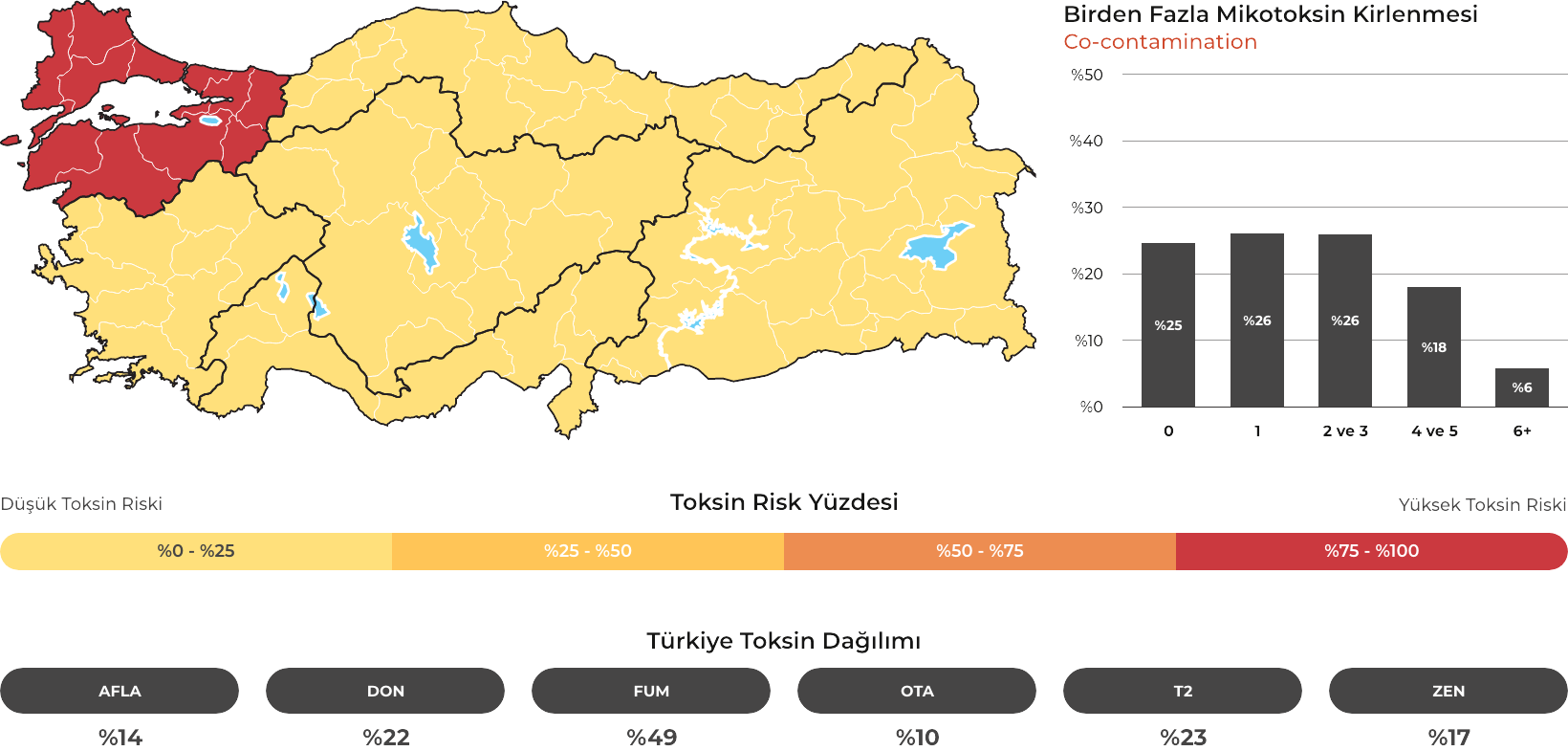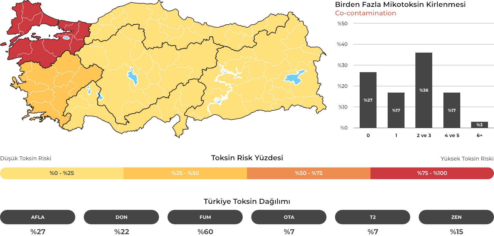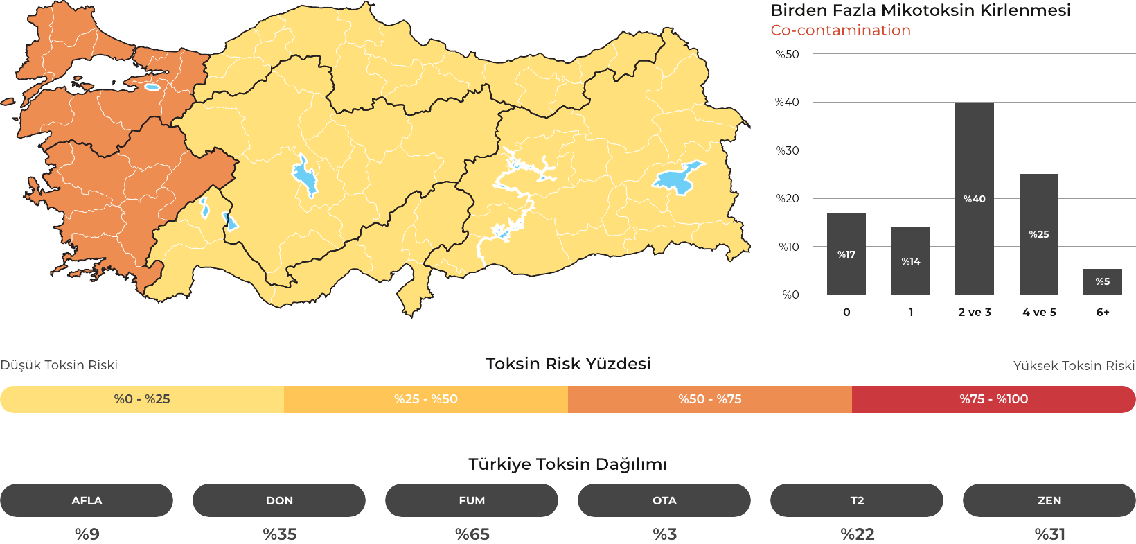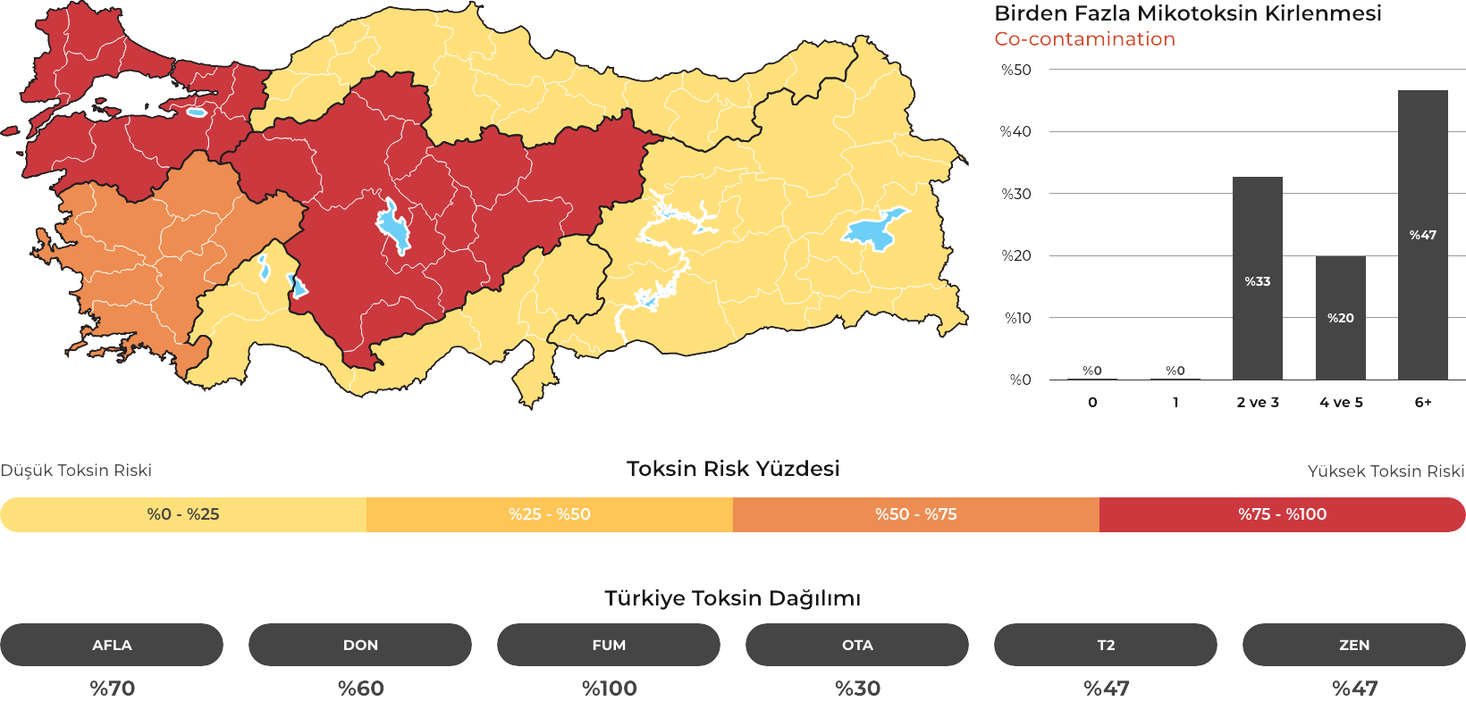 MYCOTRACE®, FAST Lab tarafından analiz edilen yem ve hammadde numunelerinden elde edilen veriler doğrultusunda, Türkiye’de mikotoksin kontaminasyonunun bölgesel ve mevsimsel dağılımını ortaya koymak ve mikotoksin riskini yıl ve çeyrek bazında sistematik olarak izlemek amacıyla geliştirilmiş bir risk analiz ve raporlama sistemidir. Güncel veriler sayesinde majör mikotoksinlerin görülme sıklığı ve risk seviyeleri düzenli olarak değerlendirilmekte; bölge, dönem ve matris bazlı farklılıklar görünür kılınarak işletmelerin karar süreçlerine bilimsel bir zemin sunulmaktadır.