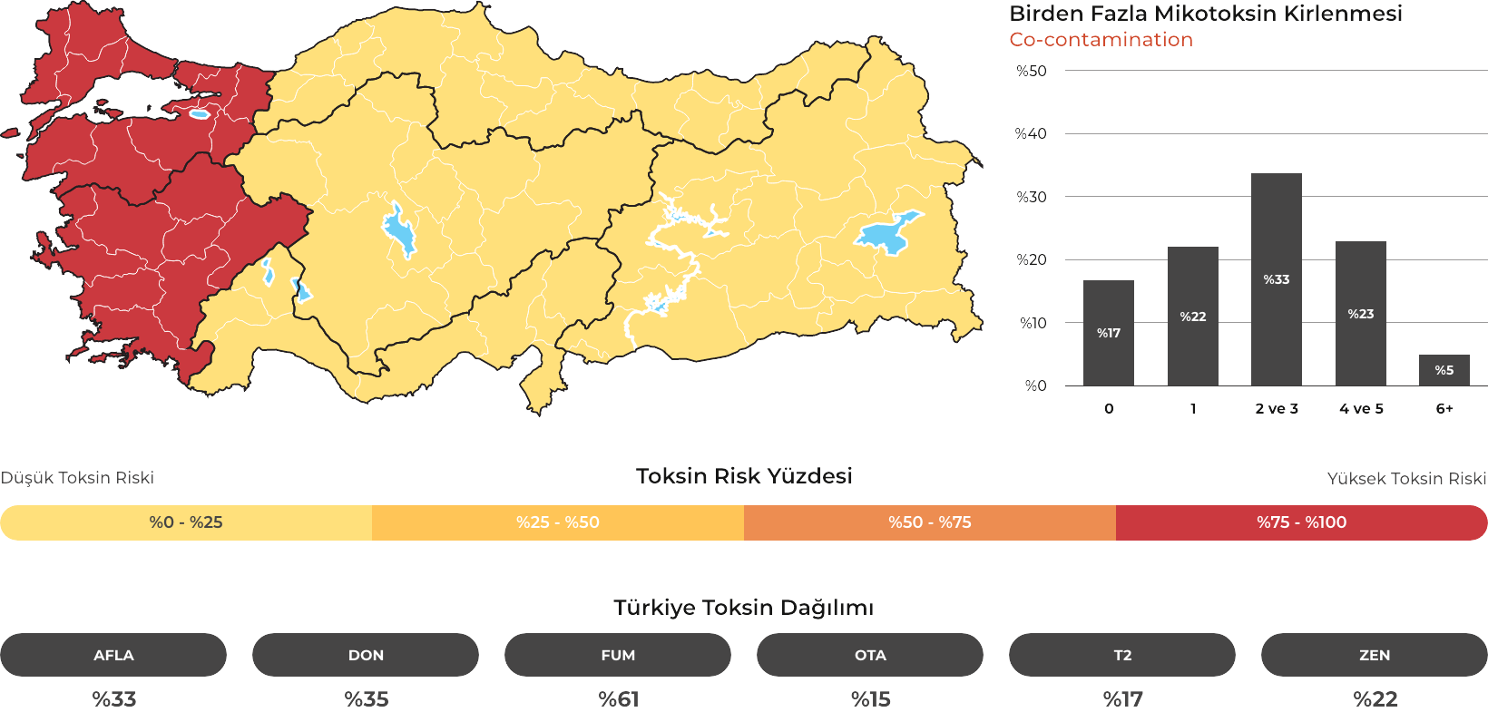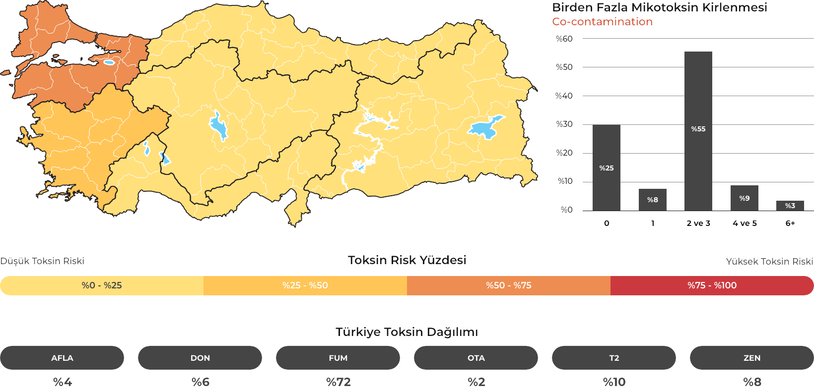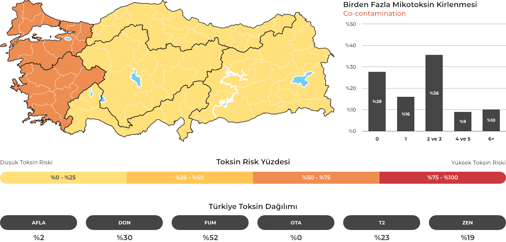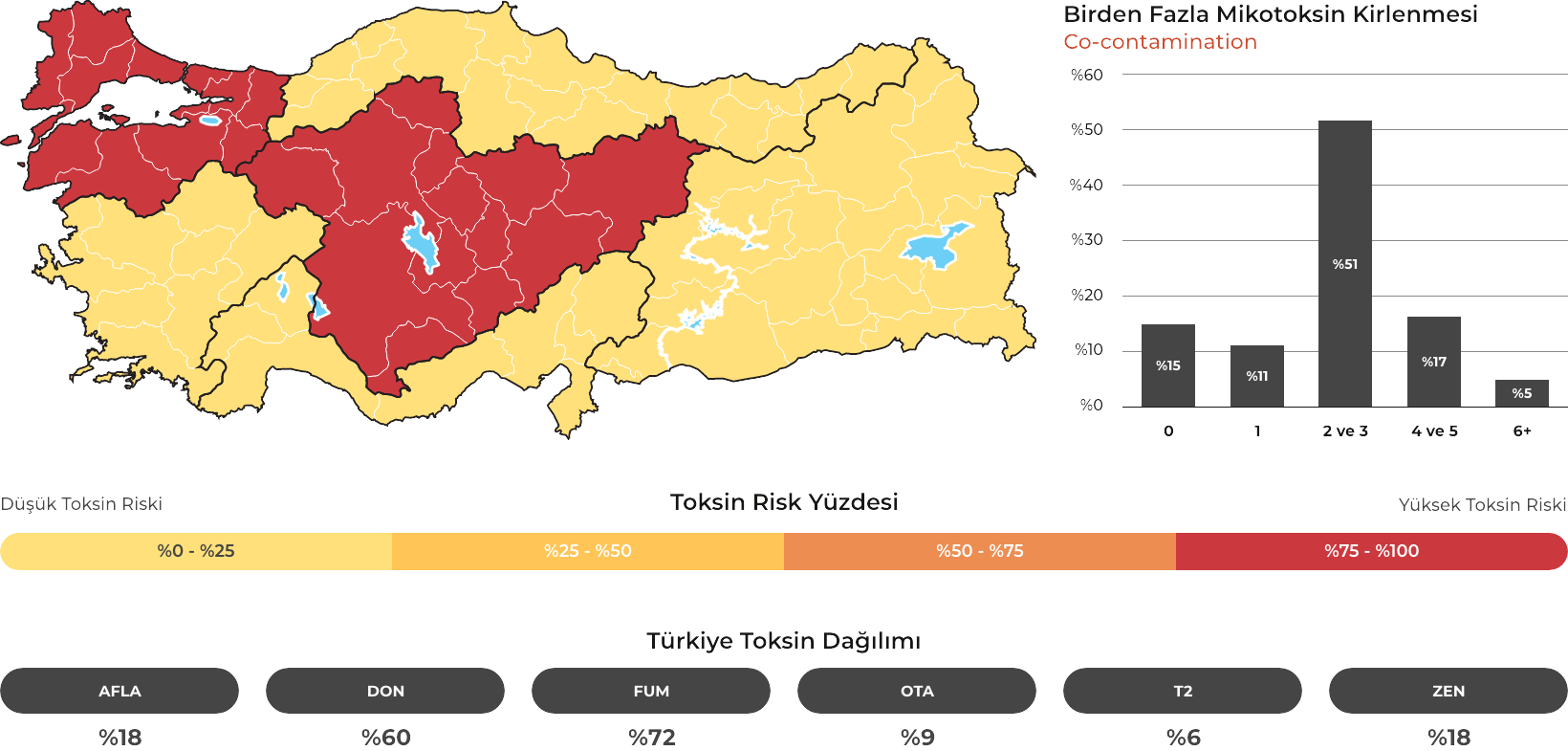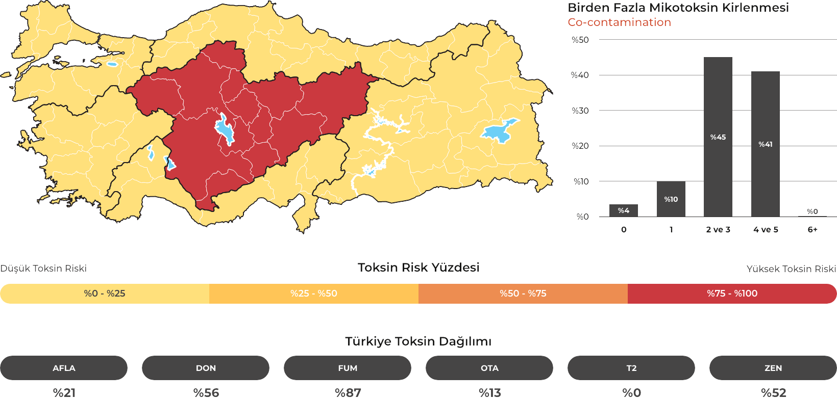 MYCOTRACE®, FAST Lab tarafından analiz edilen yem ve hammadde numunelerinden elde edilen veriler doğrultusunda, Türkiye’de mikotoksin kontaminasyonunun bölgesel ve mevsimsel dağılımını ortaya koymak ve mikotoksin riskini yıl ve çeyrek bazında sistematik olarak izlemek amacıyla geliştirilmiş bir risk analiz ve raporlama sistemidir. Güncel veriler sayesinde majör mikotoksinlerin görülme sıklığı ve risk seviyeleri düzenli olarak değerlendirilmekte; bölge, dönem ve matris bazlı farklılıklar görünür kılınarak işletmelerin karar süreçlerine bilimsel bir zemin sunulmaktadır.