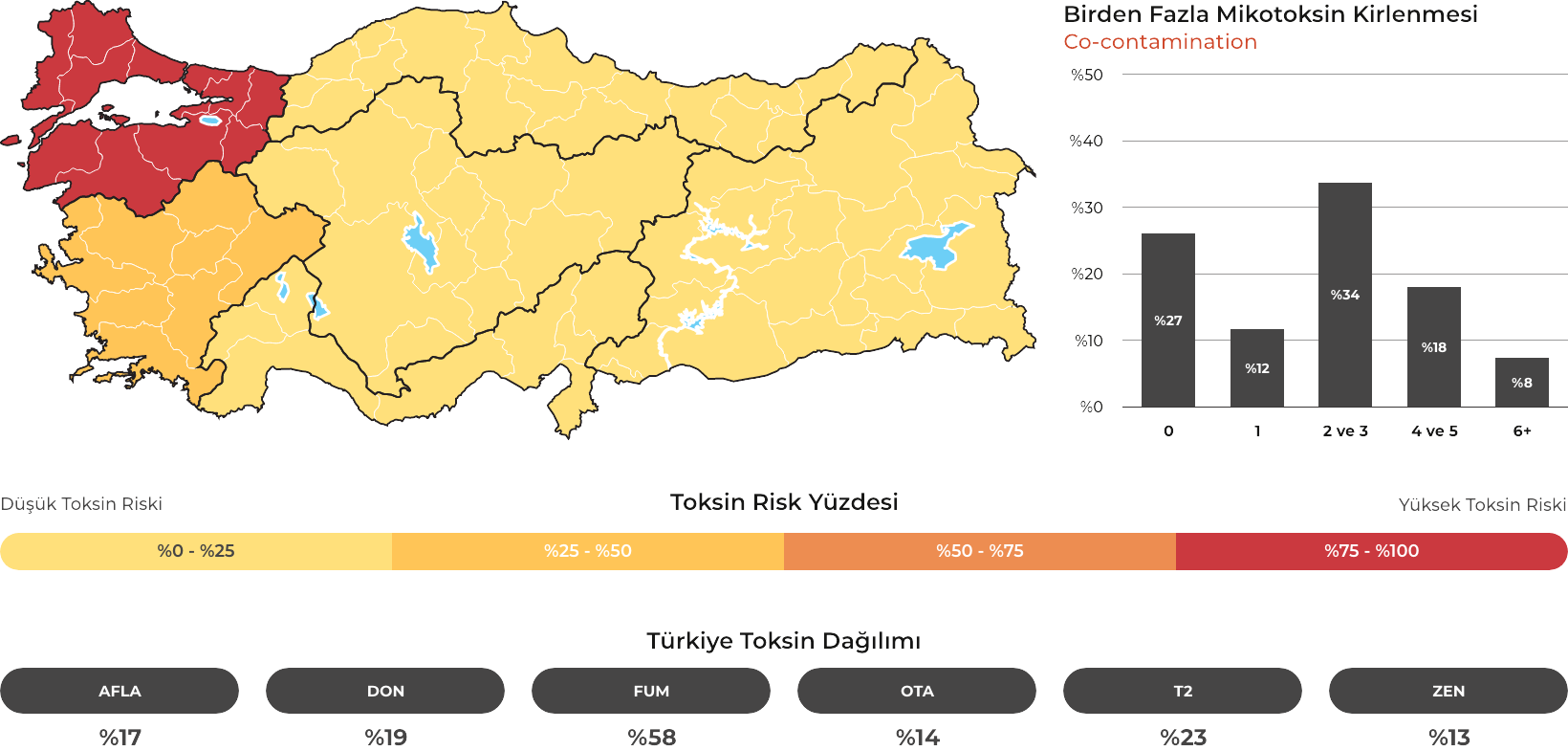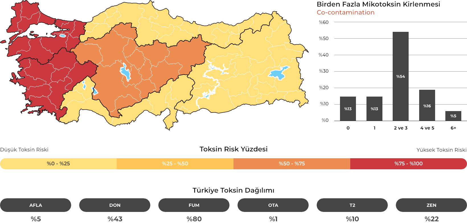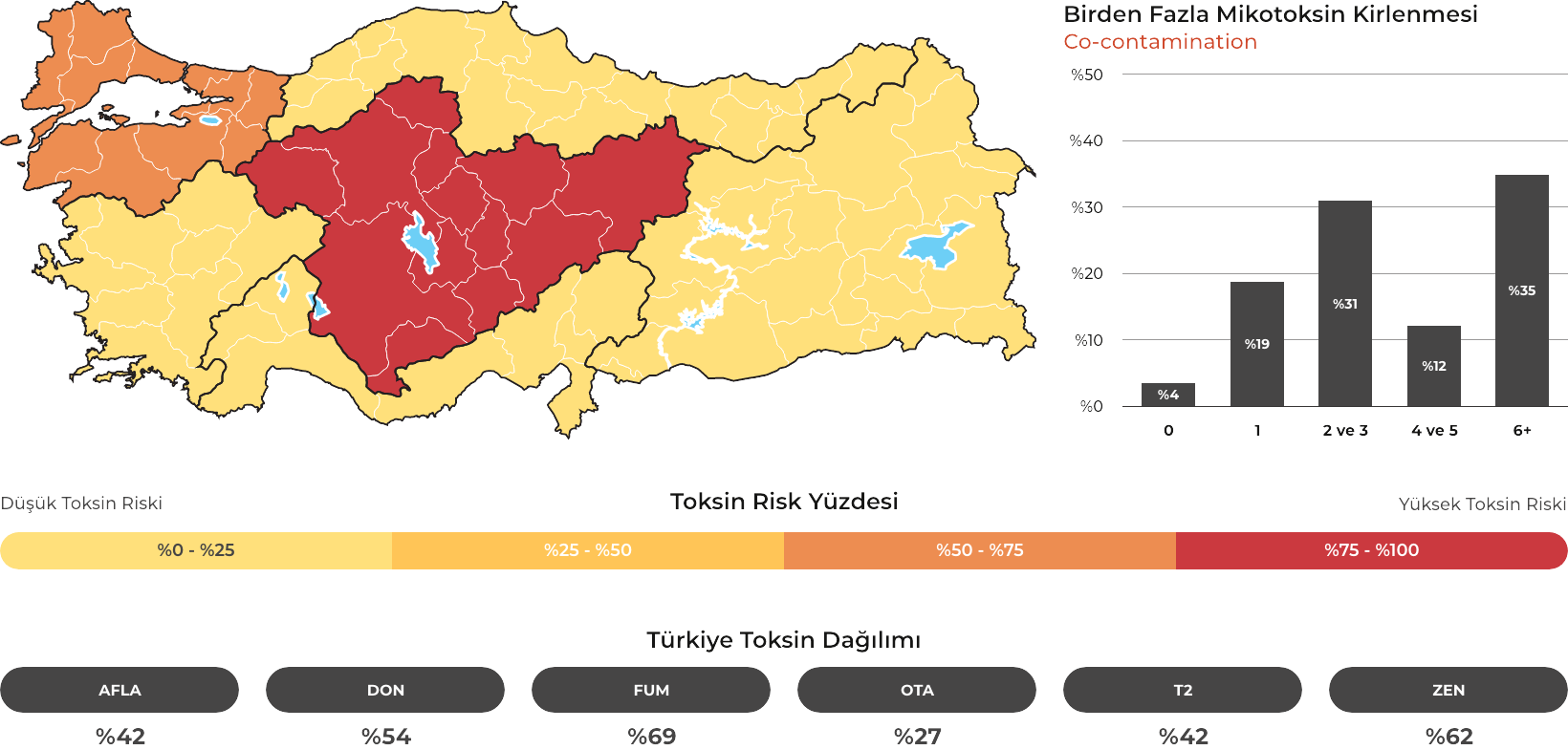 Kartal Kimya, MYCOTRACE® risk analizleri ve F.A.S.T. Lab tarafından sağlanan akredite LC-MS/MS analiz verileri doğrultusunda, yem ve hammadde kaynaklı mikotoksin risklerini bütüncül bir yaklaşımla yönetir. Risk seviyesine göre yapılandırılmış TOXFINDER® ürün ailesi ile tekli ve çoklu mikotoksin kontaminasyonuna karşı bilim temelli ve proaktif çözümler sunar.